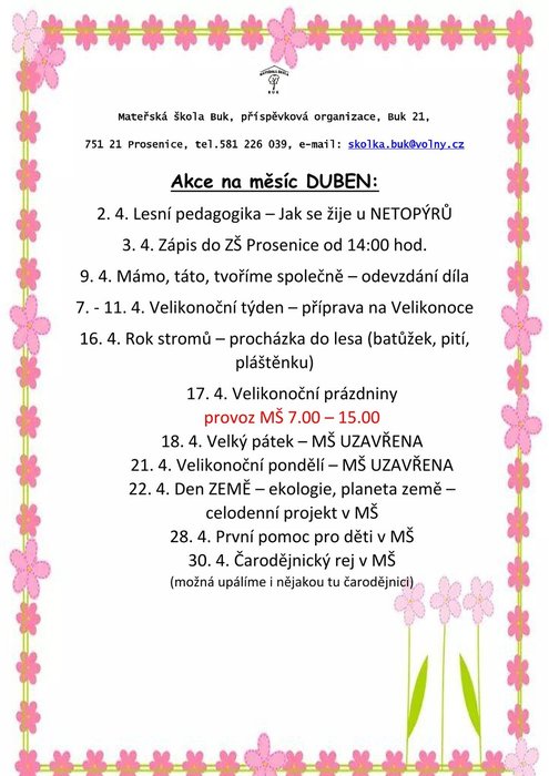 Úvod > O školce > Aktuality > Akce na měsíc DUBEN